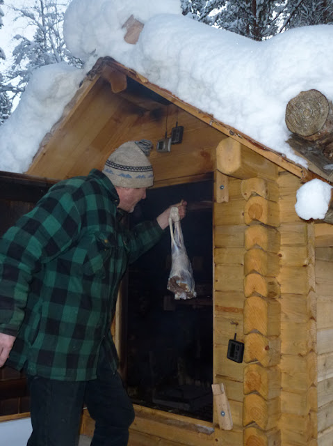 Dags för julrökningen. Här är den fina hemtimrade rökstuten med tak av näver och klovor och tätning av husmossa. Vi röker skinkstekar och renkött, och på bilden hänger Per in ett lammlår som vi röker till en familj i Vilhelmina. Det här är verklig matkvalitet!